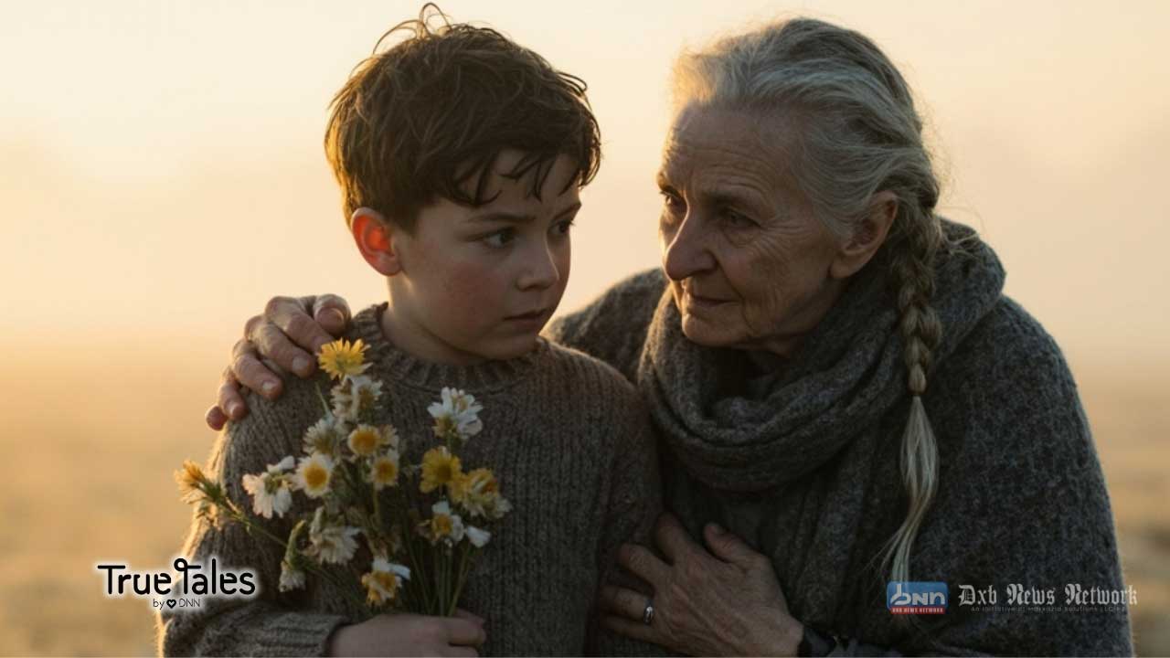 Near the edge of a field, a young boy of nine, ELIAN CARTER, kneels on the frost-covered ground. His small hands are wrapped tightly around a bunch of wildflowers, half-frozen, their petals trembling in the breeze. He places them at the base of two wooden crosses—his parents’ graves. The names are carved by hand, rough yet loving.